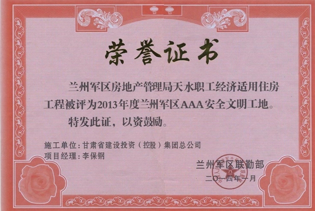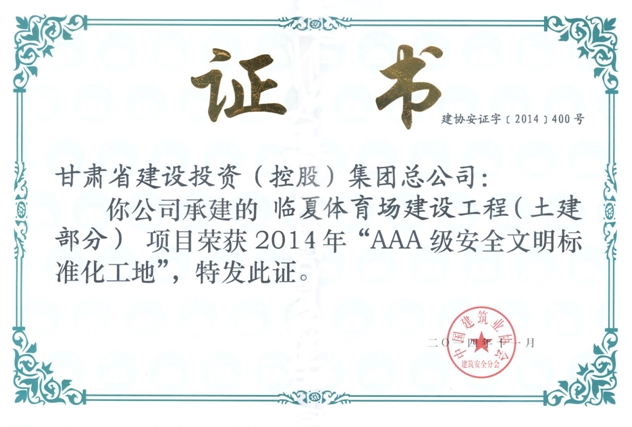 公司五年內(nèi)無死亡事故及無重大環(huán)境污染和擾民事件的發(fā)生,安全生產(chǎn)合格率100%,施工產(chǎn)值達到192707.82萬元,竣工面積為1684836m2;臨夏市體育場項目榮獲“全國AAA級安全文明標(biāo)準(zhǔn)化工地”,蘭州軍區(qū)天水職工住宅樓項目榮獲蘭州軍區(qū)“AAA級安全文明工地”,甘肅省人民醫(yī)院住院部二期7號樓8號樓項目、東川棚戶區(qū)改造AD塊9號樓10號樓項目、古浪昌靈小區(qū)公租房項目榮獲甘肅省省級文明工地,西寧城市綜合管廊項目榮獲青海省安全標(biāo)準(zhǔn)化示范省級文明工地獎項 。