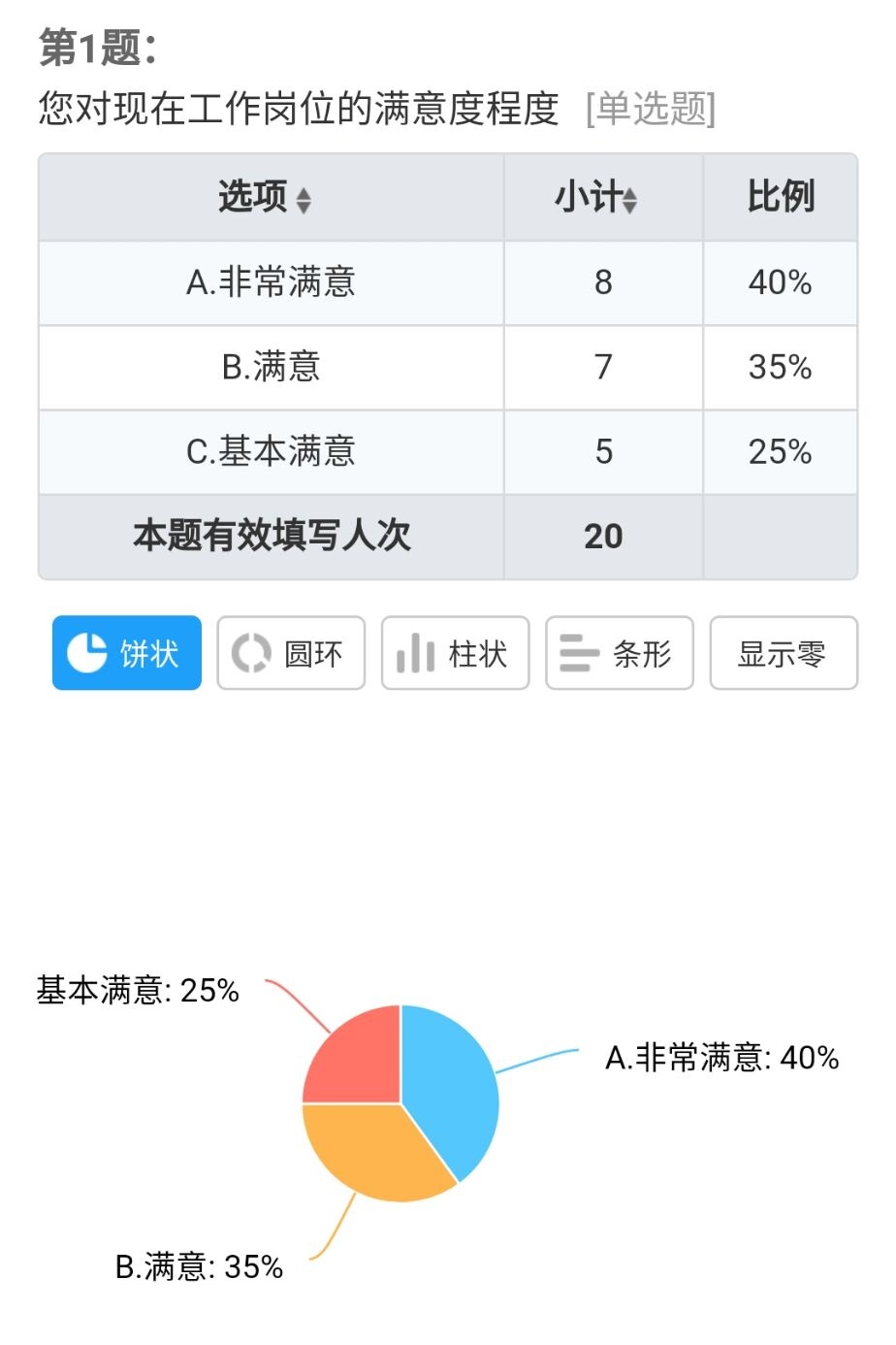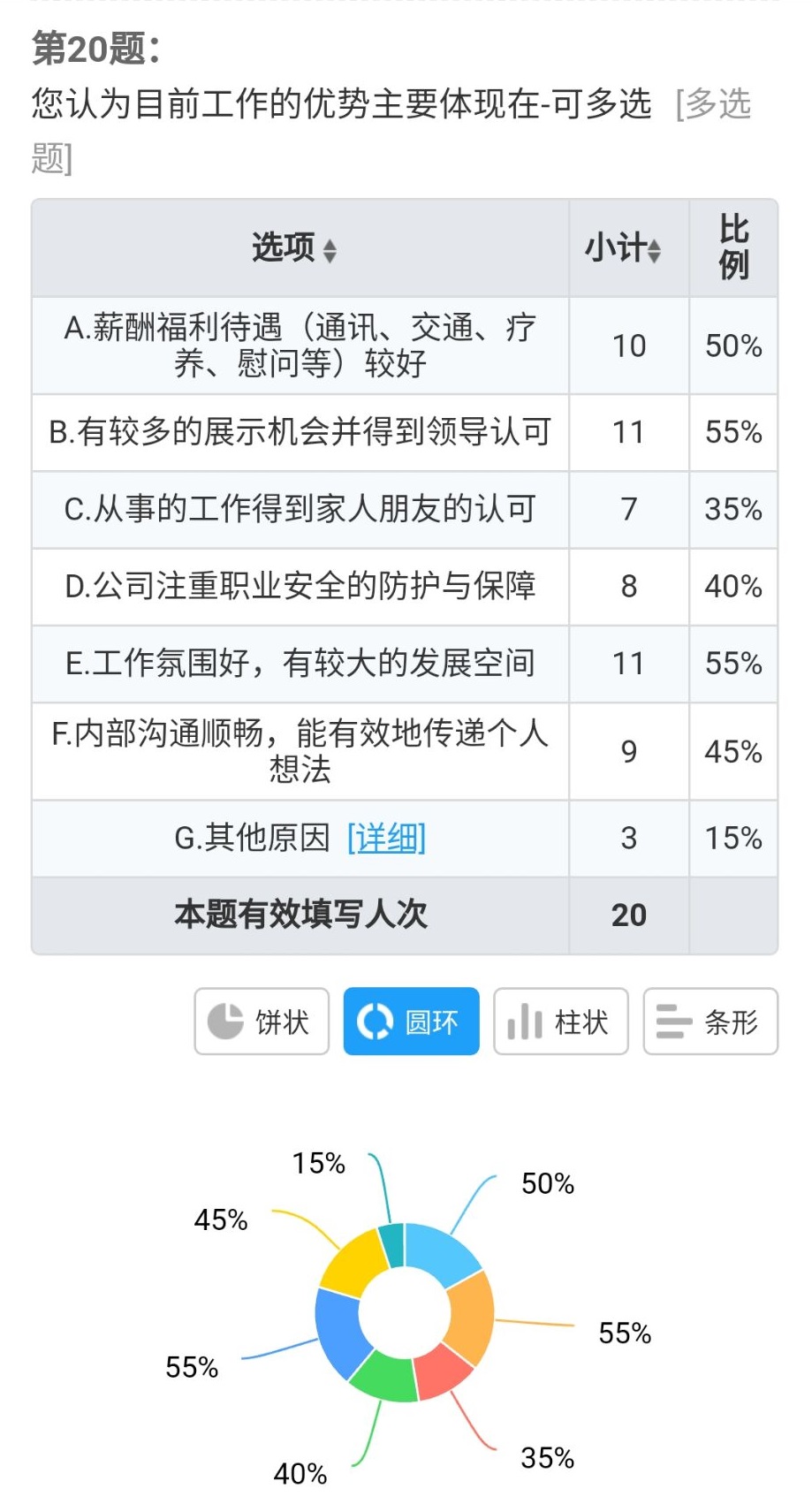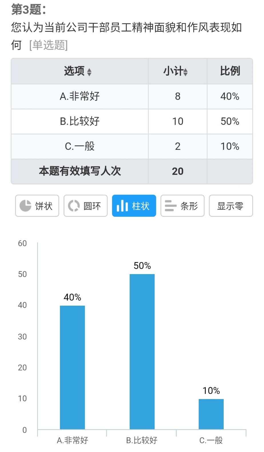 調(diào)研采用發(fā)放網(wǎng)絡(luò)問卷的方式,要求職工在線上進(jìn)行填寫,共發(fā)放20份,收回20份,問卷內(nèi)容涵蓋各科室、各年齡段以及不同性別,具有普遍性和代表性。通過網(wǎng)絡(luò)后臺(tái)統(tǒng)計(jì)匯總出的數(shù)據(jù),公司能夠比較全面且直觀地了解干部職工的思想狀況及其動(dòng)態(tài)變化,包括對公司各項(xiàng)工作、對企業(yè)改革發(fā)展的真實(shí)想法以及對個(gè)人職業(yè)發(fā)展的規(guī)劃和在工作、生活等方面的迫切需求。