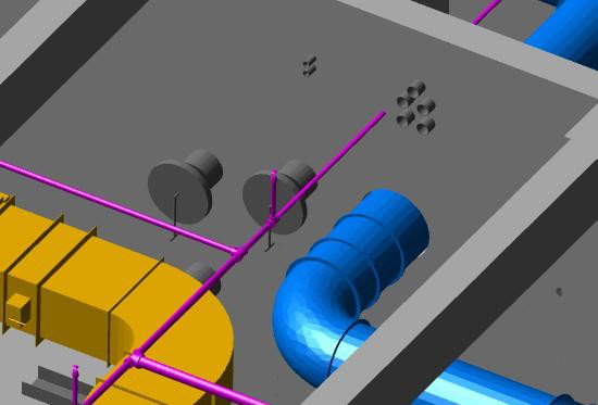 設(shè)備管道的綜合布置將所有管線通過BIM技術(shù)全部合成在一張圖上,找出復(fù)雜的交叉位置,發(fā)現(xiàn)各項(xiàng)專業(yè)在設(shè)計(jì)上存在的矛盾。根據(jù)各專業(yè)內(nèi)部的排布規(guī)則,不同專業(yè)相互間的排布規(guī)則,以及與結(jié)構(gòu)建筑的間距要求,維修空間等,具體規(guī)劃管線水平、垂直方向的分部。