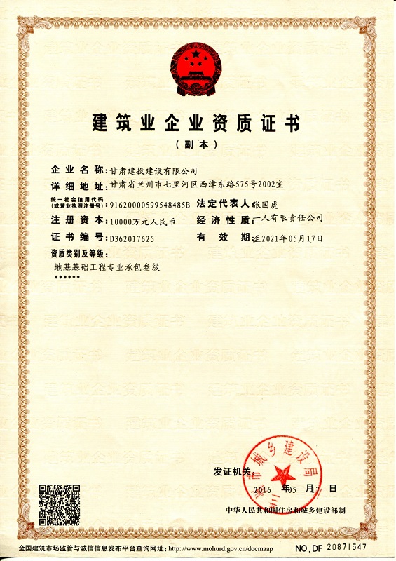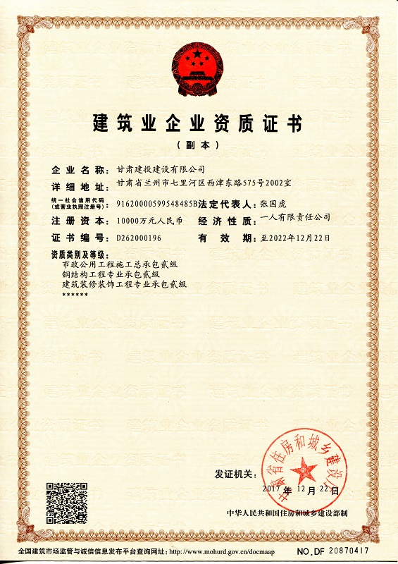 2016年以來,建設(shè)公司成功取得建筑工程施工總承包和建筑裝修裝飾工程專業(yè)承包兩項一級資質(zhì),消防設(shè)施工程專業(yè)承包二級資質(zhì)。目前,公司還具有市政公用工程施工總承包、鋼結(jié)構(gòu)工程專業(yè)承包和建筑機(jī)電安裝工程專業(yè)承包三項二級資質(zhì);地基基礎(chǔ)工程專業(yè)承包一項三級資質(zhì)。