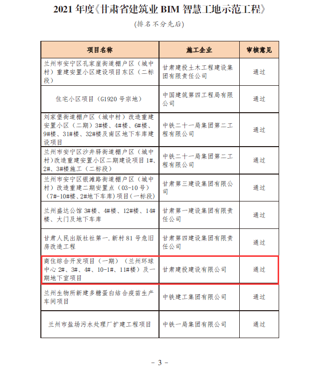近日,甘肅省建筑業(yè)聯(lián)合會公布2021年甘肅省建設工程文明工地、綠色工地示范工程名單以及2021年度《甘肅省建筑業(yè)BIM+智慧工地示范工程》評選結果。經過申報、初審、復查評價、公示等環(huán)節(jié),建設公司共計13個項目三榜有名,獲評省級文明工地、綠色工地示范工程、BIM+智慧工地示范工程。