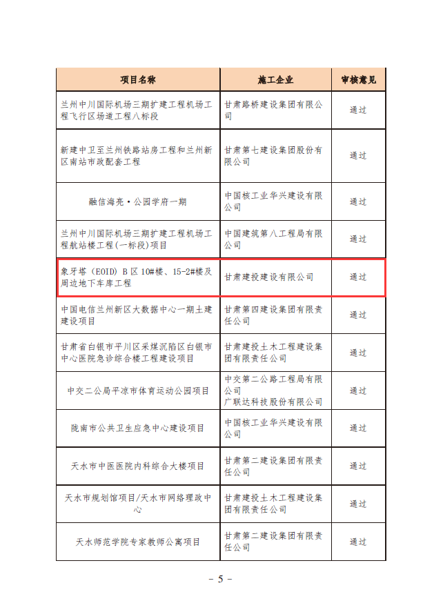 獲得“2021年甘肅省建設建設工程文明工地”的項目分別為:建設一公司承建的甘肅省軍糧庫綜合保障基地一期項目二標段、百酈天香項目四標段;建設三公司承建的象牙塔(EOID)B區(qū)10#樓、15-2#樓及周邊地下車庫工程、渭源縣城北環(huán)路東段棚戶區(qū)改造項目S2區(qū)5#-10#樓建設工程;建設四公司承建的定西市安定區(qū)關川中學建設項目;建設五公司承建的環(huán)縣北區(qū)公共租賃住房建設項目(一標段);建設六公司承建的蘭州·桃李春風康養(yǎng)小鎮(zhèn)(一期)項目、天水市麥積區(qū)上尚宅二期(一標段);建設八公司承建的臨夏市肖家棚戶區(qū)改造安置小區(qū)C區(qū)建設項目施工二標段;建設九公司承建的蘭州環(huán)球中心1#、6#、7#、8#、9#、10-2#樓、供熱站、小區(qū)大堂及二期地下室項目,天水市圖書館新館建設項目,天水市文化館新館建設項目。