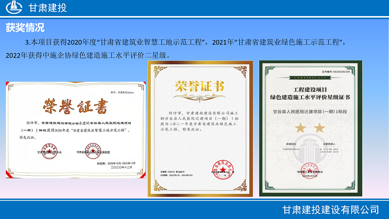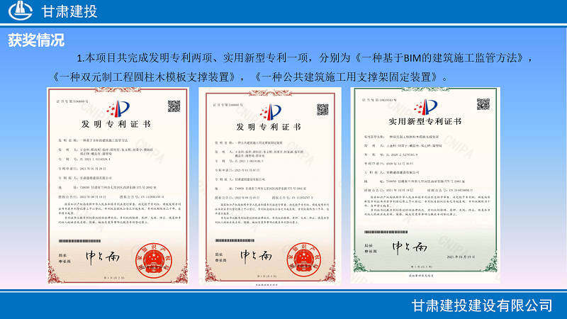 此前該項目還授權發(fā)明專利2項、實用新型專利1項,獲評省級工法1項,獲得省、市級文明工地、甘肅省建筑業(yè)智慧工地示范工程、甘肅省建筑業(yè)綠色施工示范工程、綠色建造施工水平評價二星級、首屆(2020)全國數字項目大獎賽二等獎等獎項。