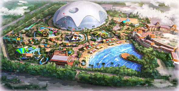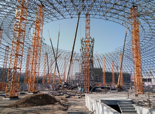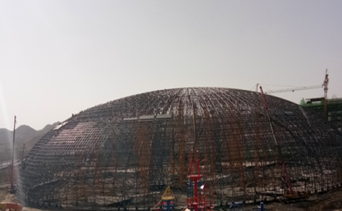 直屬項(xiàng)目部主要承建室內(nèi)水上樂園、溫泉度假酒店、會(huì)議中心及輔房四個(gè)單體,水上樂園室內(nèi)館工程是西部恐龍園水世界的核心地標(biāo)性建筑,是水世界的標(biāo)志性建筑,建筑形式為雙螺旋球網(wǎng)架,基礎(chǔ)形式為樁筏聯(lián)合,井樁共計(jì)473根,整體建筑為橢圓形建筑,其中長軸200米,短軸176米,網(wǎng)架中心建筑高度為40米,是目前西北最大的雙螺旋球網(wǎng)架結(jié)構(gòu)建筑。