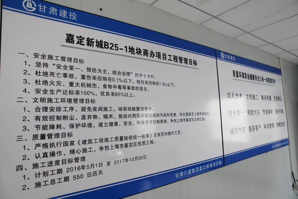 項目部從樹立企業(yè)品牌的高度,把工程質(zhì)量目標(biāo)定位于創(chuàng)“上海市嘉定區(qū)優(yōu)質(zhì)工程”,安全文明施工創(chuàng)“上海市嘉定區(qū)文明工地”。項目黨支部從項目辦公室、宿舍、食堂等設(shè)施的建設(shè)入手,嚴(yán)格按照甘肅建投文明施工標(biāo)準(zhǔn)要求,區(qū)分好施工區(qū)域、生活區(qū)域及辦公區(qū)域,把工地各種設(shè)備按照工具化、標(biāo)準(zhǔn)化的要求進(jìn)行設(shè)置和搭設(shè)。