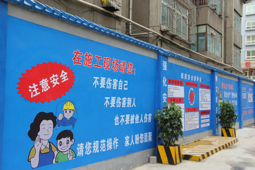 該項(xiàng)目現(xiàn)場(chǎng)較為狹小,場(chǎng)地及工作面都很緊張,但做到了國(guó)家及公司對(duì)標(biāo)準(zhǔn)化文明施工現(xiàn)場(chǎng)的各項(xiàng)要求:3#綜合樓緊鄰的建工中街由一個(gè)跨度為10米的安全防護(hù)棚和一個(gè)4米的人行道防護(hù)棚組成防護(hù)體,對(duì)馬路上來(lái)往的車(chē)輛、行人及商鋪經(jīng)營(yíng)者和辦公區(qū)工作人員進(jìn)行有效的保護(hù)。進(jìn)入施工現(xiàn)場(chǎng),映入眼簾的是一道整齊、規(guī)范的安全警示宣傳文化墻,包含整容鏡、公示欄、宣傳欄、安全講評(píng)臺(tái)、總平面布置圖、消防臺(tái)等內(nèi)容;正對(duì)大門(mén)的茶水亭、吸煙室也較為醒目;現(xiàn)場(chǎng)共分為鋼筋加工區(qū)、木工區(qū)、周轉(zhuǎn)料堆放區(qū)、辦公區(qū)和主體建筑物等五塊,功能分區(qū)明顯,標(biāo)示標(biāo)牌懸掛到位,安全警示標(biāo)志隨處可見(jiàn)。施工建筑主體內(nèi)干凈衛(wèi)生,臨邊及樓梯防護(hù)搭設(shè)標(biāo)準(zhǔn)、規(guī)范,電梯井防護(hù)采用了定型化防護(hù)門(mén),各預(yù)留洞口均進(jìn)行了隔層或?qū)訉臃忾]。