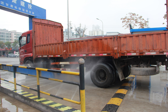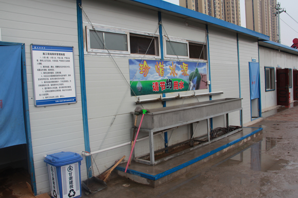 傳統(tǒng)施工時,生活用水和施工用水混合使用,并且沒有循環(huán)利用,污染、浪費嚴重。綠色施工中,生活用水和施工用水嚴格分開。通過洗漱間的水用過后,要回收利用在衛(wèi)生間里。采訪中,記者注意到這樣一個細節(jié),載重卡車駛出工地時,將在門口停頓,兩側圍欄上隨即噴射出水柱對沾滿泥土的輪胎和擋板進行沖洗。技術負責人劉志剛說,這是項目部僅花了幾千元自行制作的洗車臺,為了防止載重車攜帶泥漿污染市區(qū)道路,而沖洗后的水通過收集、沉淀后二次利用。