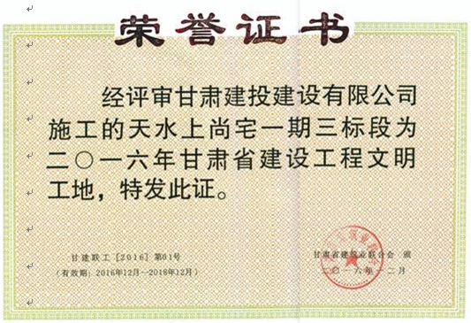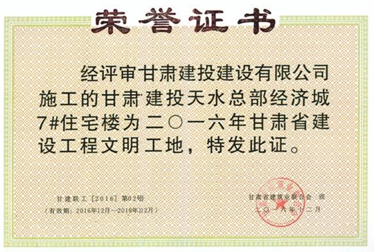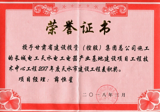 公司2015年度被中共甘肅建投建設(shè)有限公司黨委評(píng)為“先進(jìn)黨支部”榮譽(yù)稱號(hào),2016年度被甘肅建投建設(shè)有限公司評(píng)為“先進(jìn)集體”榮譽(yù)稱號(hào)。天水總部經(jīng)濟(jì)城7#樓、天水上尚宅5#、9#樓被評(píng)為省級(jí)安全文明工地,中海河山郡二期23#、27#樓及相連地下車庫(kù)工程被評(píng)為“建設(shè)杯”二等獎(jiǎng),長(zhǎng)城工程技術(shù)中心項(xiàng)目榮獲“麥積獎(jiǎng)”“飛天獎(jiǎng)”,長(zhǎng)城電工中壓氣體絕緣廠房項(xiàng)目“大面積耐磨地坪結(jié)合鋼釬維混凝土施工”獲得省級(jí)工法。