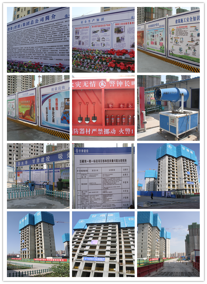 在開工前,甘肅建投建設(shè)公司二公司和直屬分公司就組建了技術(shù)經(jīng)驗(yàn)豐富和管理水平高超的項(xiàng)目管理班子謀劃前期施工策劃和組織施工,為了確保質(zhì)量,工程開工伊始,建設(shè)公司就制定了確?!敖ㄔO(shè)杯”“白塔獎(jiǎng)”,爭創(chuàng)“飛天獎(jiǎng)”的質(zhì)量目標(biāo)。項(xiàng)目部制定了詳細(xì)的質(zhì)量控制措施。針對分部分項(xiàng)工程,項(xiàng)目部及時(shí)進(jìn)行施工組織設(shè)計(jì),對于樓梯等混凝土施工較困難的部位采用整體鋼模板澆筑,保證截面尺寸以及樓梯踏步表面的平整度,大大提升了施工質(zhì)量,加快施工進(jìn)度。項(xiàng)目部對安全施工高度重視,目前為止未有任何安全事故發(fā)生,施工現(xiàn)場采用附著式升降腳手架代替?zhèn)鹘y(tǒng)的懸挑式腳手架,其防護(hù)網(wǎng)相比密目網(wǎng)更安全, 防護(hù)更到位,大大加快了腳手架爬升速度,節(jié)省材料,節(jié)省人工,縮短了施工周期。在綜合治理的指導(dǎo)方針下,項(xiàng)目部為所有現(xiàn)場工作人員提供質(zhì)量達(dá)到國家安全標(biāo)準(zhǔn)的工作防護(hù)工具,例如絕緣手套、絕緣鞋、護(hù)目鏡、高空防滑鞋等一系列種類齊全的防護(hù)用具。同時(shí),施工現(xiàn)場設(shè)有專職安全管理員,對施工人員嚴(yán)格要求,凡是進(jìn)入施工現(xiàn)場人員必須戴好安全帽,凡是高空作業(yè)人員必須系好安全帶,凡是干焊接等對身體具有一定危險(xiǎn)性的工作必須做好安全防范措施,如戴好防護(hù)措施等。在施工人員閑暇時(shí)反復(fù)為工人們講解做好安全工作的重要性,積極為工人們講解做好安全防范工作的小技巧。項(xiàng)目部就施工現(xiàn)場的安全防范工作建立了“一崗雙責(zé)”制度,對于安全工作的責(zé)任分工,進(jìn)行細(xì)化,將責(zé)任落實(shí)到人,并建立安全工作處罰條例,對于部分施工人員不把安全當(dāng)回事,工地逞英雄等一系列惡劣的違反安全條例的行為,一方面進(jìn)行安全教育,另一方面,對其給予一定的處罰,以提高其安全防范意識。