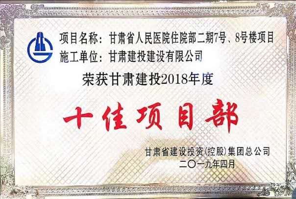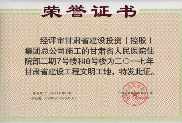 該項(xiàng)目自開工以來,安全文明施工管理取得了一定的成效,接受了省安質(zhì)局、蘭州市城市管理行政執(zhí)法局、蘭州市環(huán)保局、蘭州市綜治辦、蘭州市建設(shè)局等政府主管部門及甘肅建投的多次檢查,均得到了好評,曾一度被評為甘肅建投系統(tǒng)“安全文明施工”第一名,同時(shí),項(xiàng)目的安全文明施工成果也得到了建設(shè)單位、監(jiān)理單位以及社會(huì)各界的認(rèn)同和贊譽(yù)。在2017年,甘肅省人民醫(yī)院項(xiàng)目部被甘肅省建筑業(yè)聯(lián)合會(huì)評為甘肅省建設(shè)工程文明工地。2018年度甘肅省人民醫(yī)院住院部二期7號樓和8號樓項(xiàng)目被中國建筑業(yè)協(xié)會(huì)建筑安全分會(huì)評為2018年參加全國范圍組織學(xué)習(xí)交流的建設(shè)工程施工安全生產(chǎn)標(biāo)準(zhǔn)化工地。